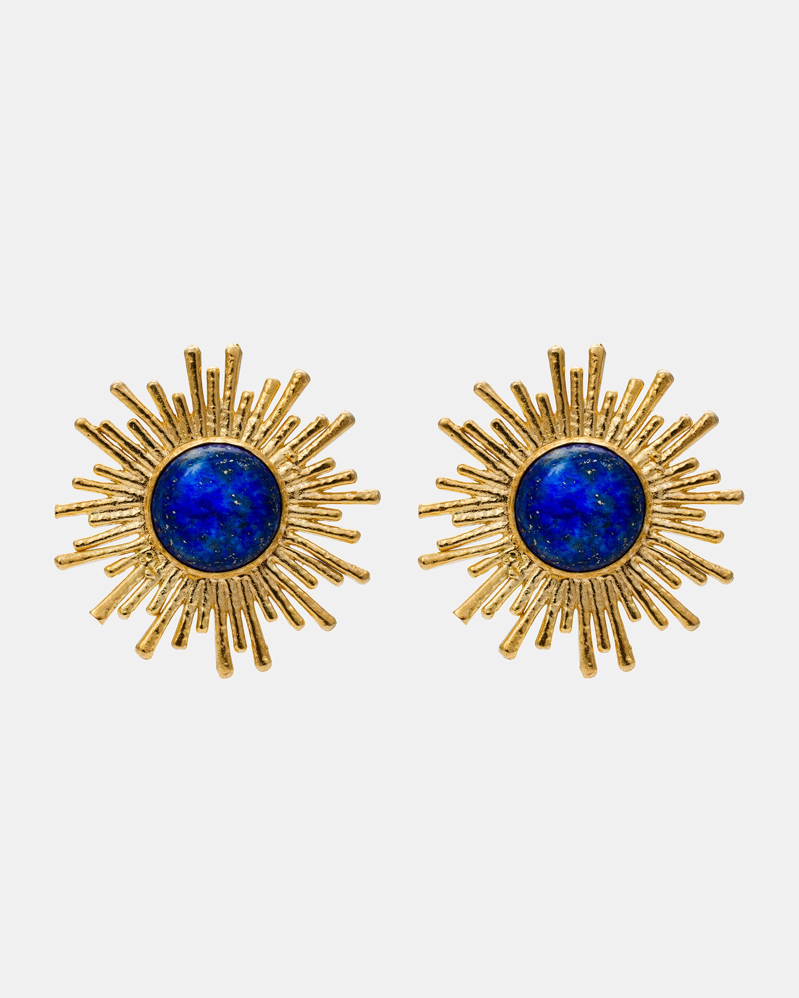 Radiate timeless elegance with these stunning sunburst earrings featuring the deep blue hues of lapis lazuli. Known as the stone of wisdom and truth, lapis lazuli is believed to inspire self-expression and inner clarity. Framed by a golden sunburst, these earrings are perfect for adding a touch of celestial charm to any look.