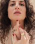 To maintain the shine of your ring, avoid contact with water, perfumes, and harsh chemicals. Store in a soft pouch or jewelry box when not in use. Clean gently with a soft, dry cloth.