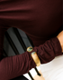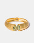 A sculptural gold-plated cuff with ribbed detailing, finished with two cabochon-cut Prehnite stones. Known as the stone of serenity and renewal, Prehnite is believed to bring peace and balance to the wearer. Elegant and grounding, this bracelet is a refined heirloom for everyday and evening wear.