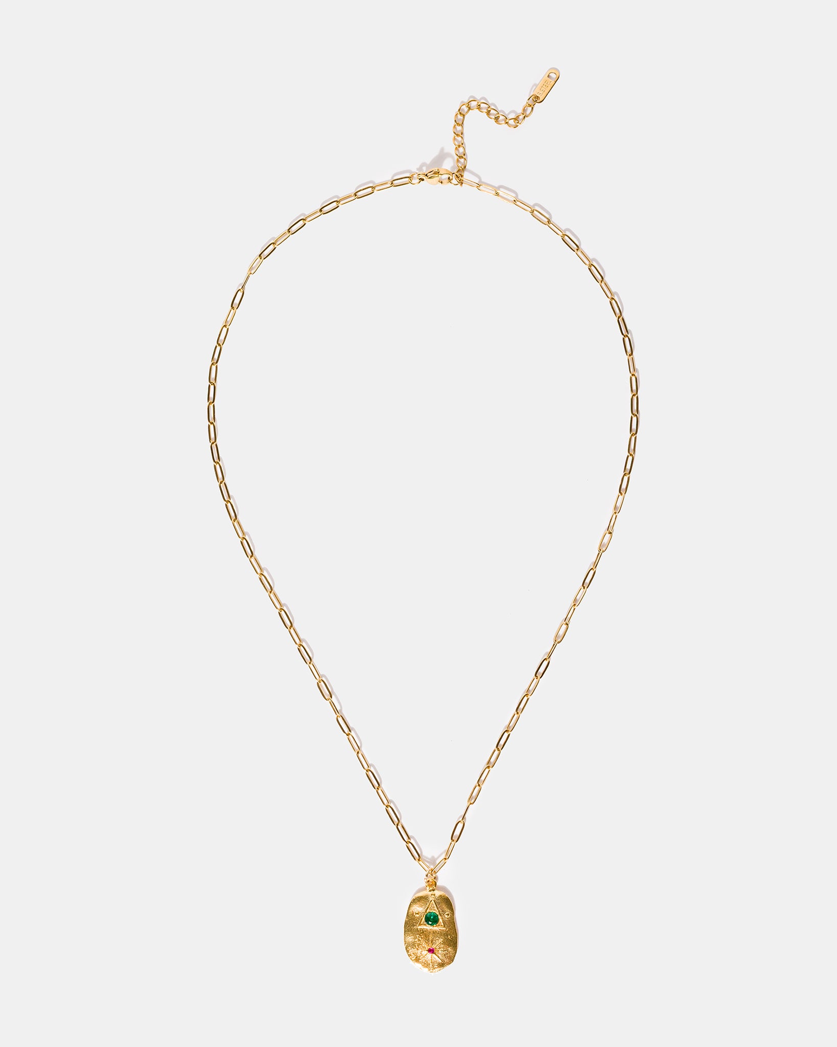A symbolic oval pendant combining a triangular emerald-green cubic zirconia with a ruby-pink star-set stone. With its softly textured 18k gold-plated surface, this piece blends mystical charm with a timeless, heirloom-like quality.
