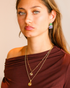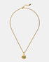 A round medallion pendant with a softly hammered surface, glowing with the timeless beauty of an emerald-green cubic zirconia. Its 18k gold-plated finish lends a rich heirloom character, evoking jewelry passed down through generations. Handcrafted with care in small batches, it carries a balance of elegance and symbolism.